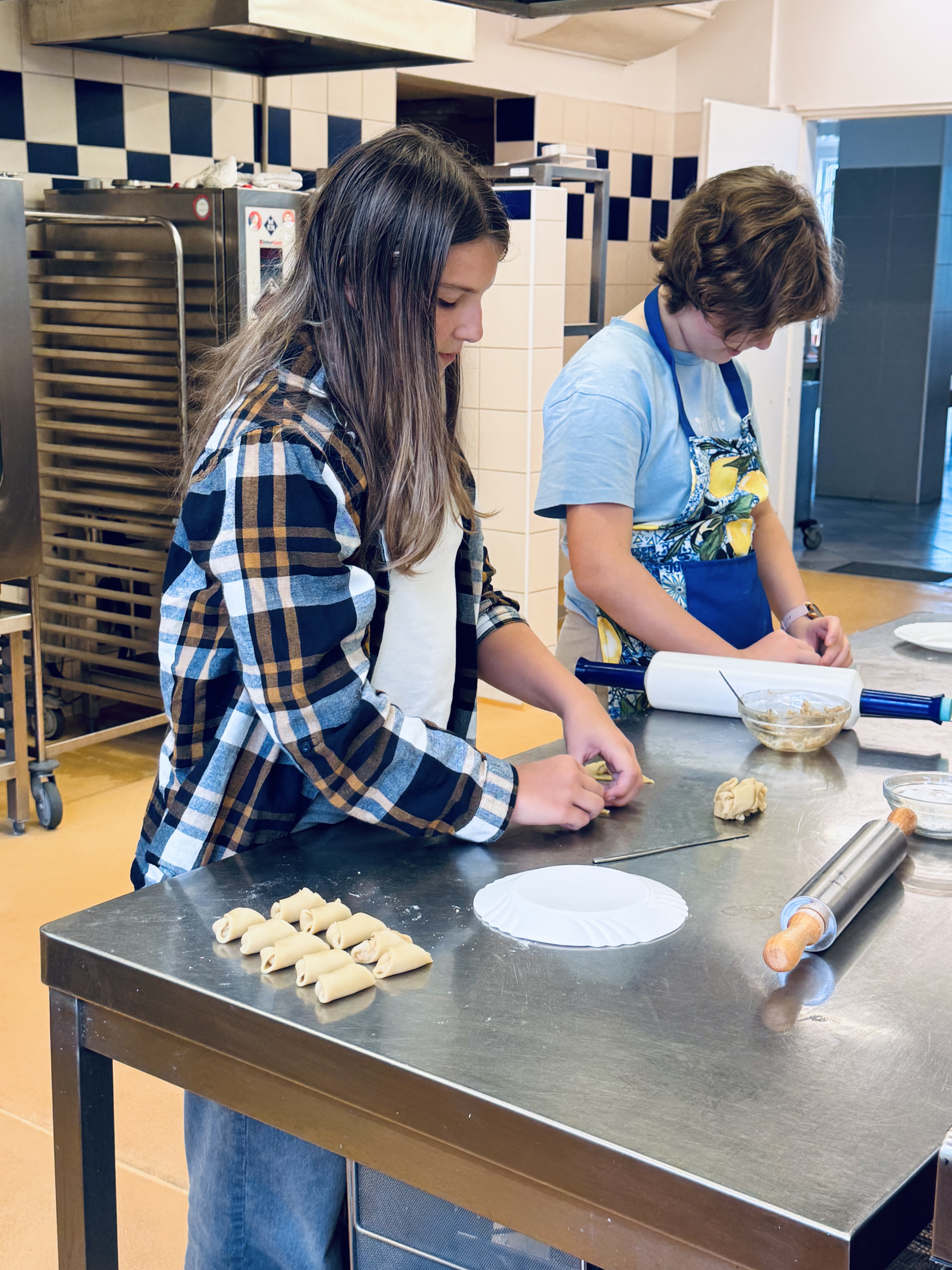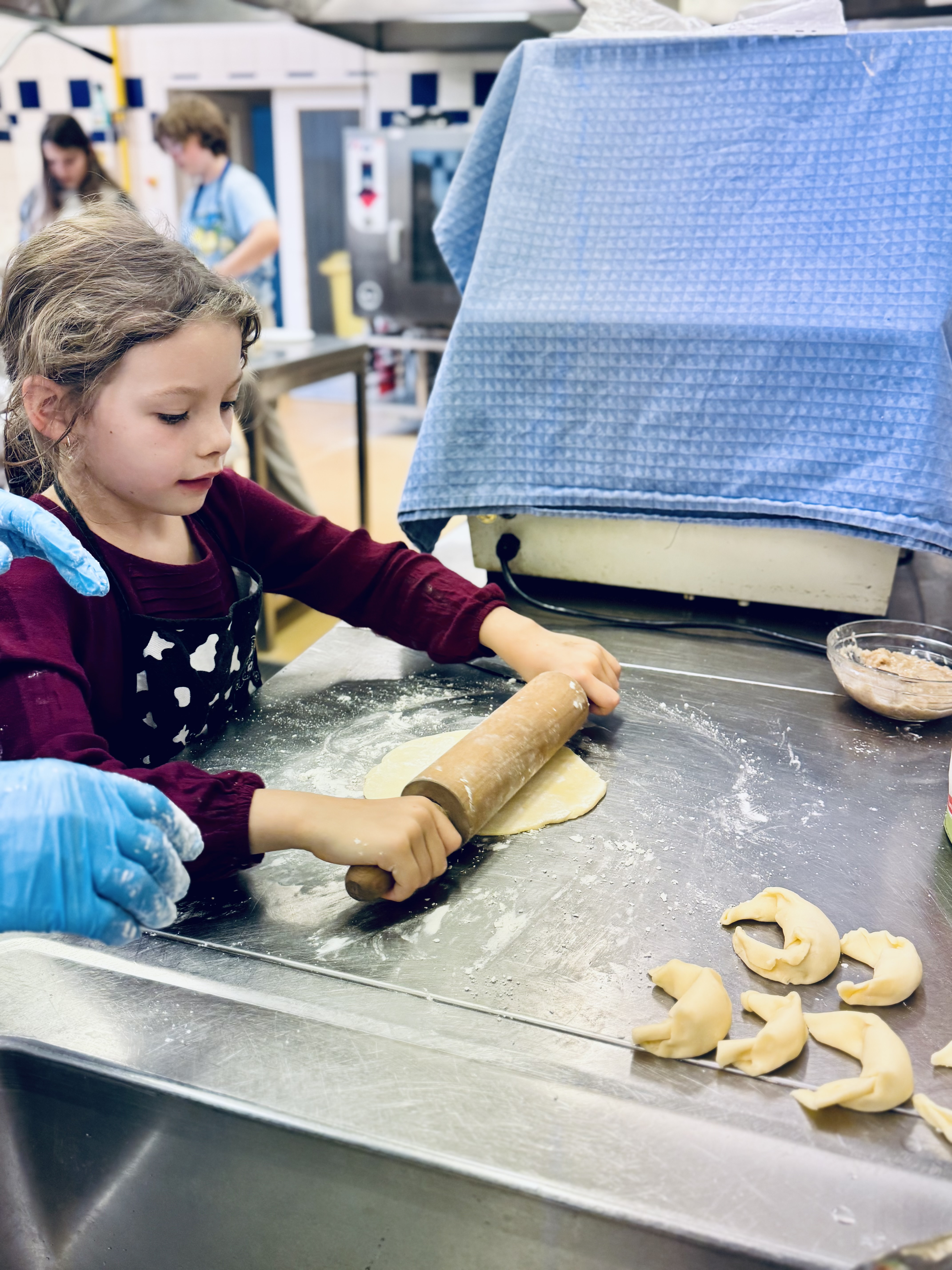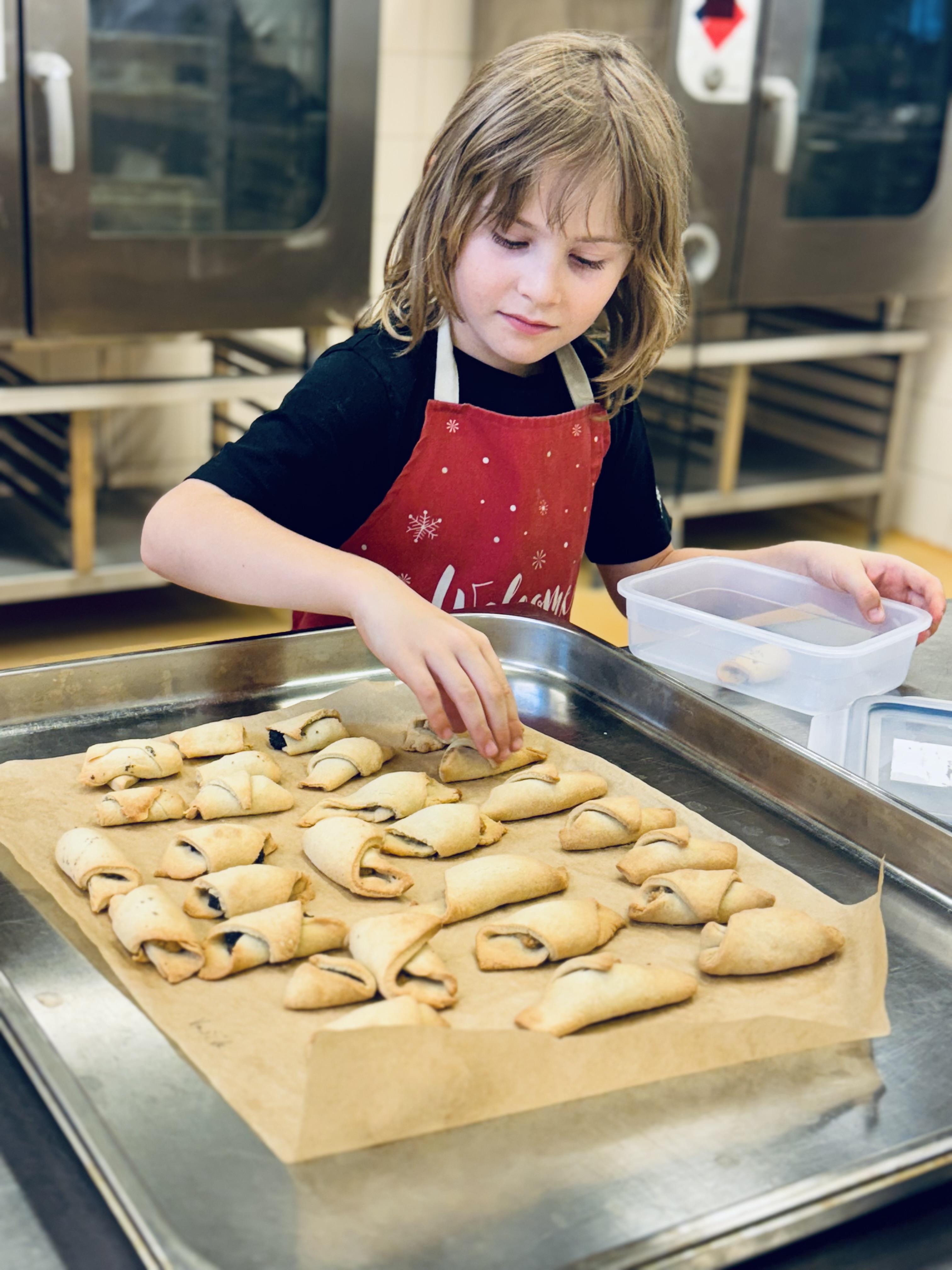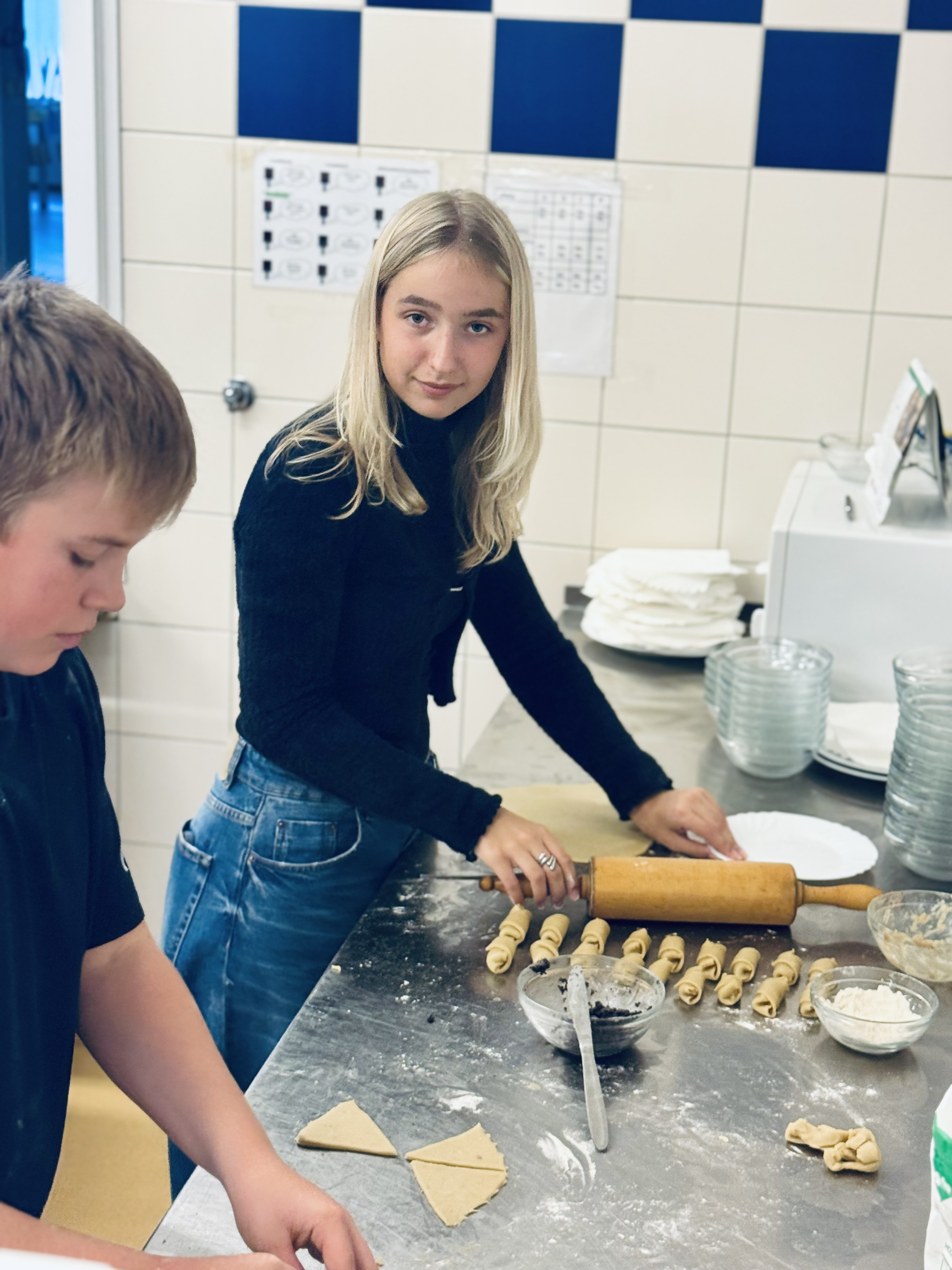 Čtvrtá lekce byla ve znamení tradice. I když se snažím každý rok zařazovat nové recepty, svatomartinské rohlíčky prostě nesměly chybět! Tentokrát jsme připravovali dvě varianty náplní – ořechovou a makovou, aby si každé dítě našlo svého favorita. Pekli jsme tentokrát ve velké školní kuchyni, kde máme přece jen více prostoru a pohodlí než v menších kuchyňkách. Děti si tak odnesly domů pořádnou dávku rohlíčků – věřím, že jste si na nich s chutí pochutnali!