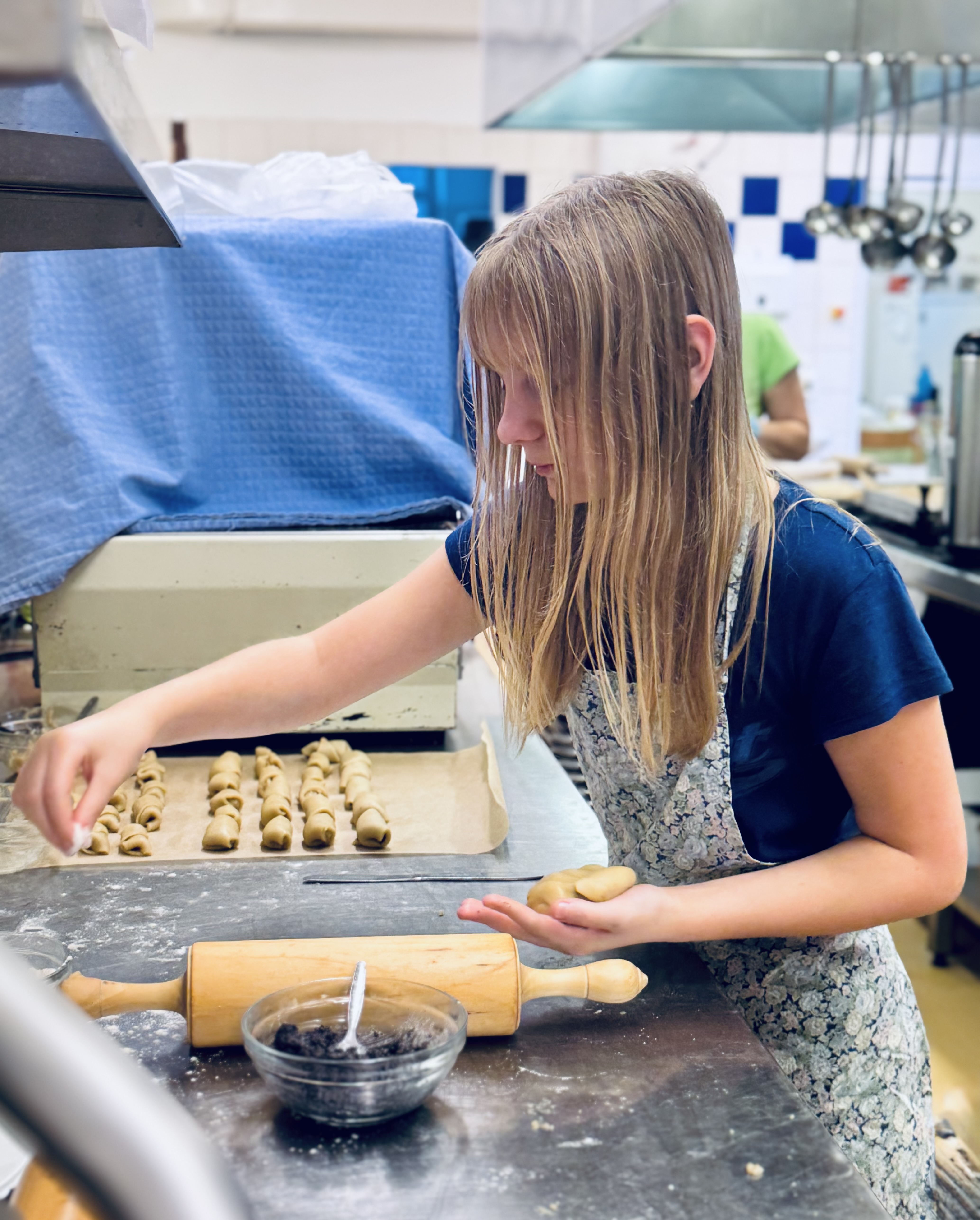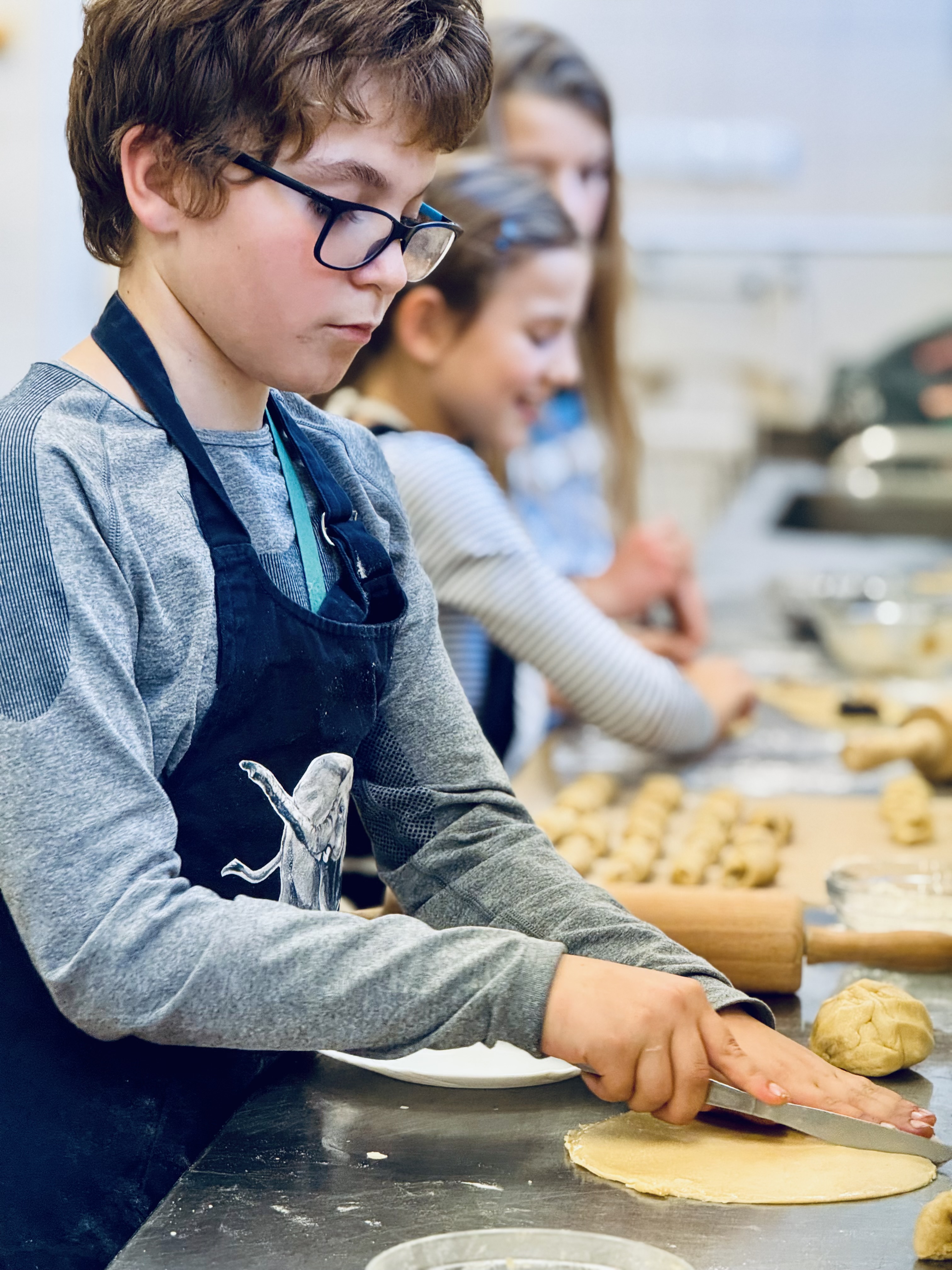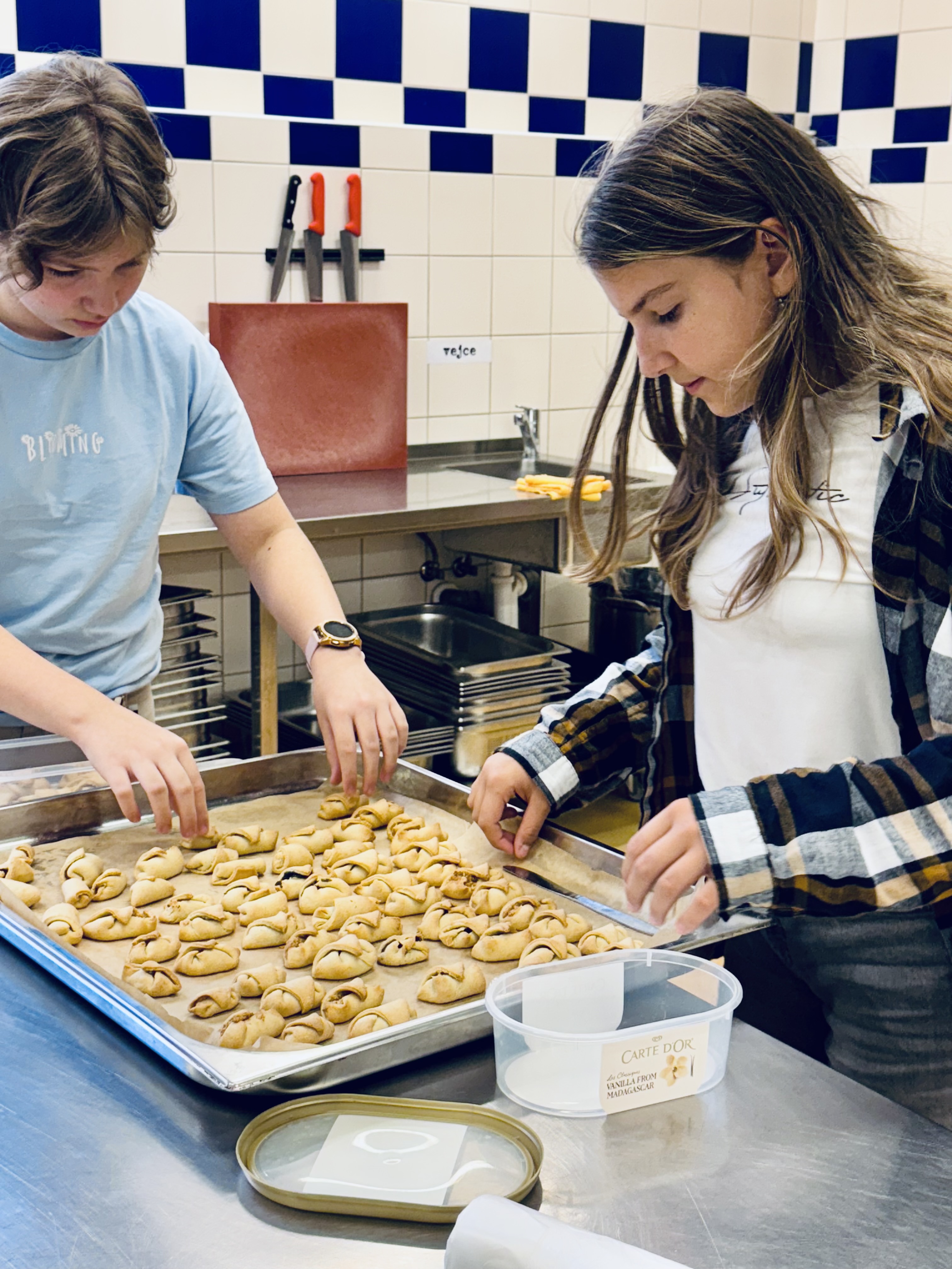 Čtvrtá lekce byla ve znamení tradice. I když se snažím každý rok zařazovat nové recepty, svatomartinské rohlíčky prostě nesměly chybět! Tentokrát jsme připravovali dvě varianty náplní – ořechovou a makovou, aby si každé dítě našlo svého favorita. Pekli jsme tentokrát ve velké školní kuchyni, kde máme přece jen více prostoru a pohodlí než v menších kuchyňkách. Děti si tak odnesly domů pořádnou dávku rohlíčků – věřím, že jste si na nich s chutí pochutnali!
