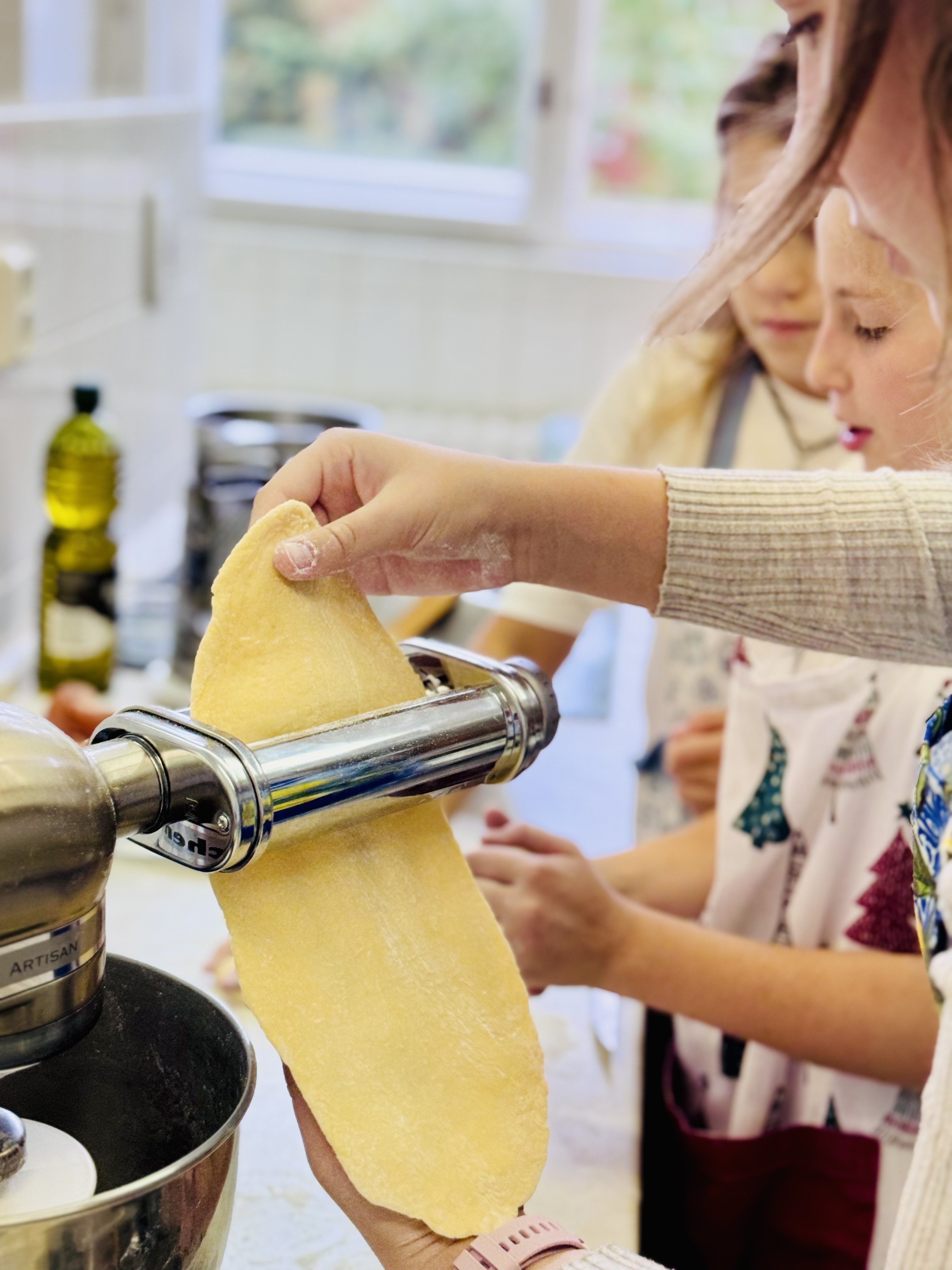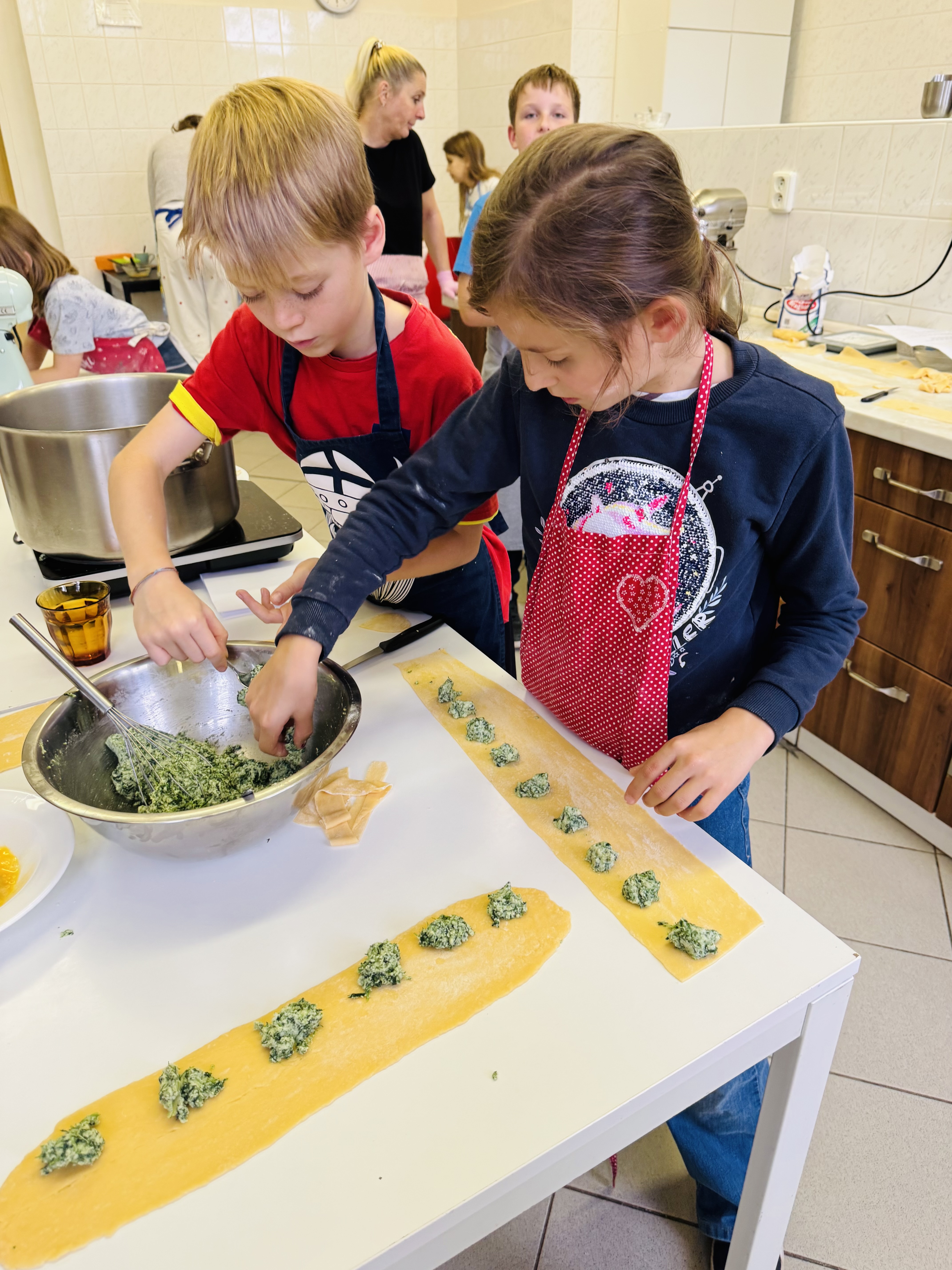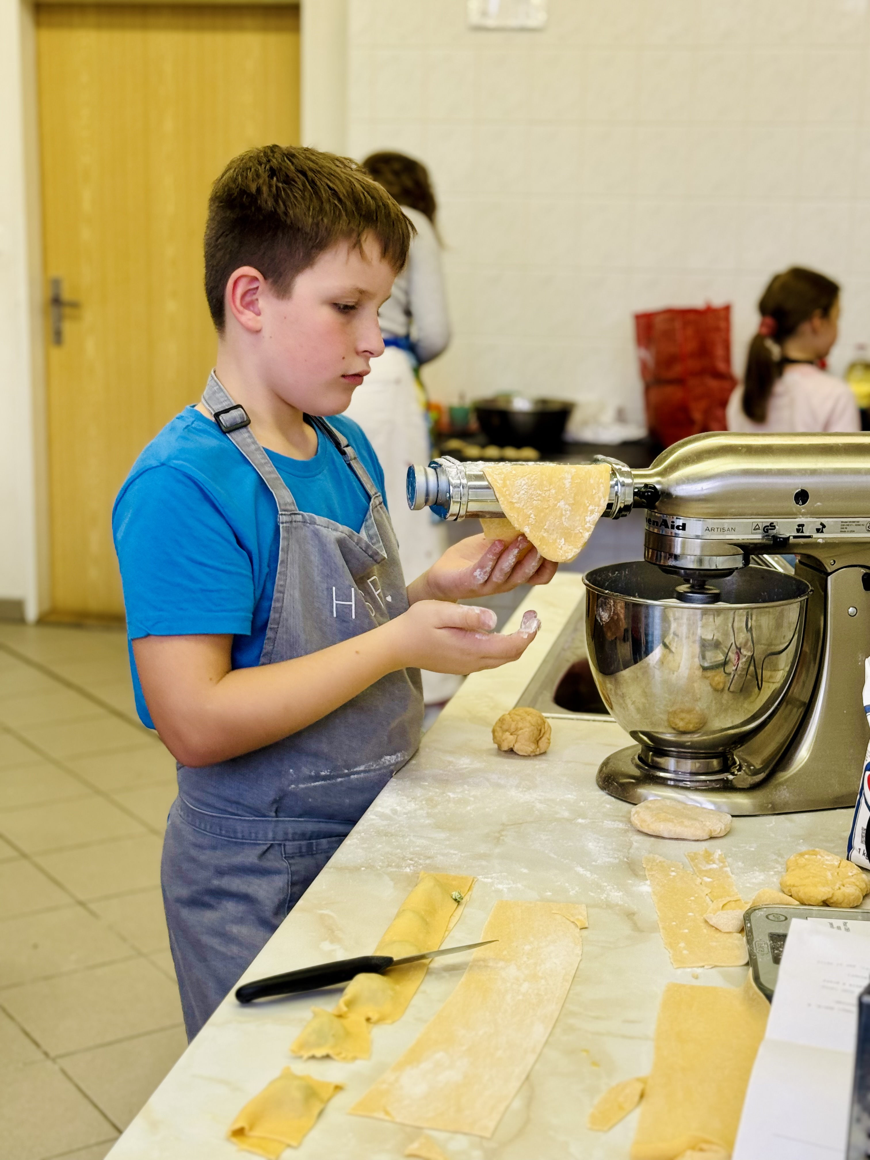 K ruce nám byly strojky na těstoviny, které jsou součástí robotů KitchenAid, takže nám práce šla krásně od ruky. Děti si vyzkoušely válení, plnění i tvarování těstovin – a výsledky stály za to!