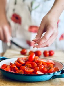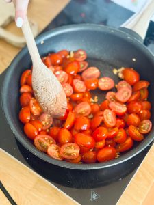 2. Přidáme cherry rajčátka a krátce podusíme.