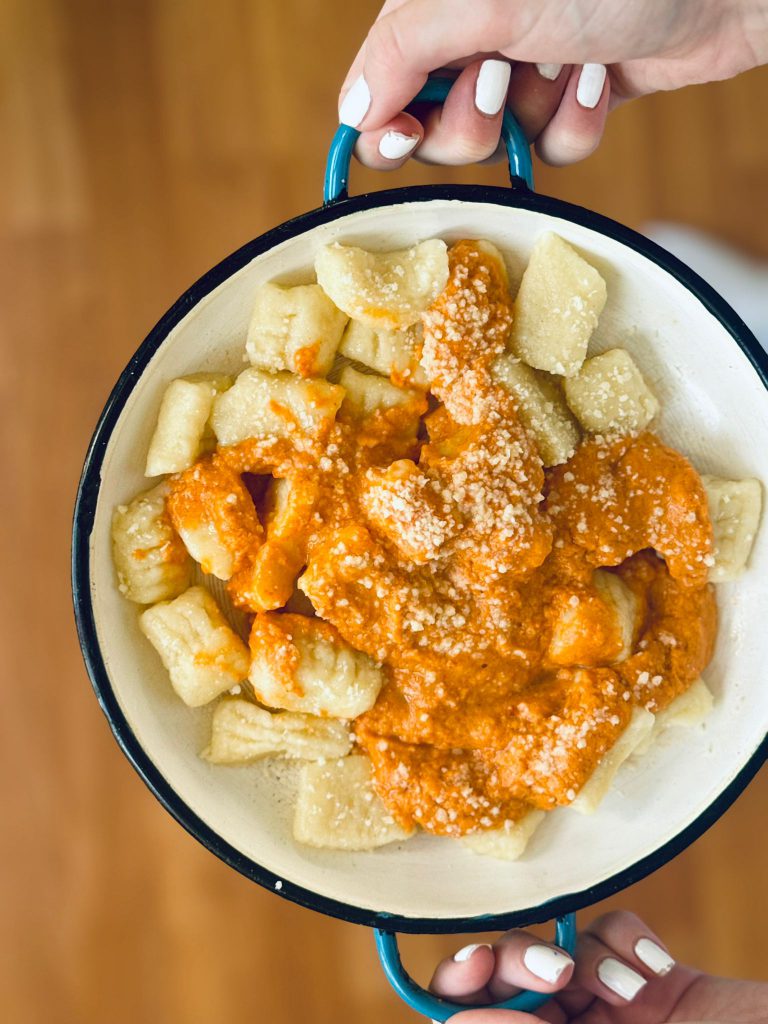 5. Horkou omáčku nalijeme na čerstvě uvařené noky. Posypeme parmazánem.